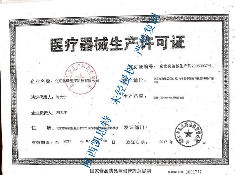 医疗器械生产许可证编号:京食药监械生产许20050037号
