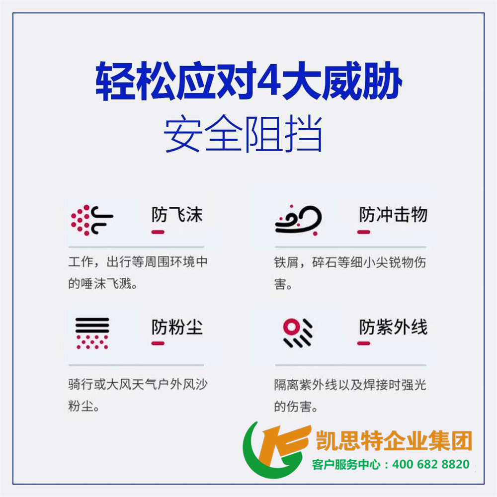 2、270度曲面、宽大双防雾、2.0防冲击镜片,佩戴者视界更宽大、没有视觉疲劳感、压抑感。