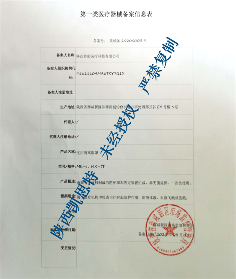 医疗器械生产备案凭证编号:陕西咸食药监械生产备20200001号