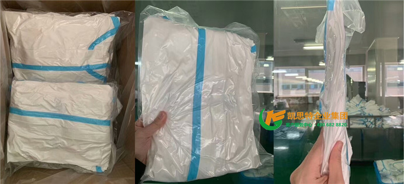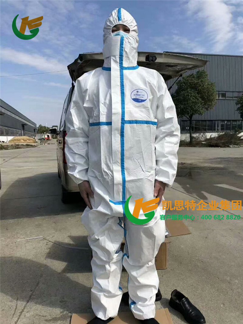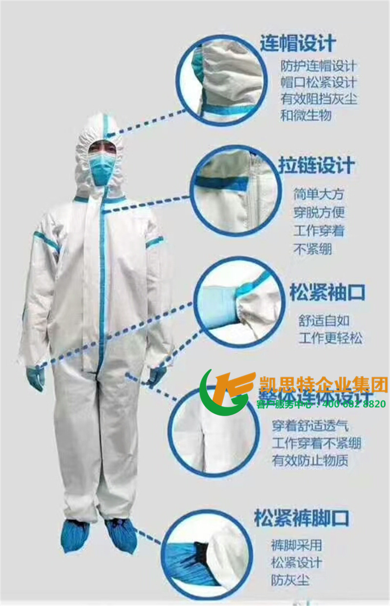 【产品材料】医用透气复合膜为主要原材料,为高级医用防护材料,经裁剪缝纫制成加厚型衣帽一体连体服,手腕处,脚踝处均有弹性收口,材质轻盈、透气。