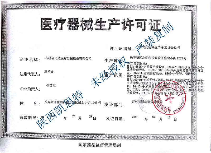 医疗器械生产许可证编号:吉食药监械生产许20150052号
