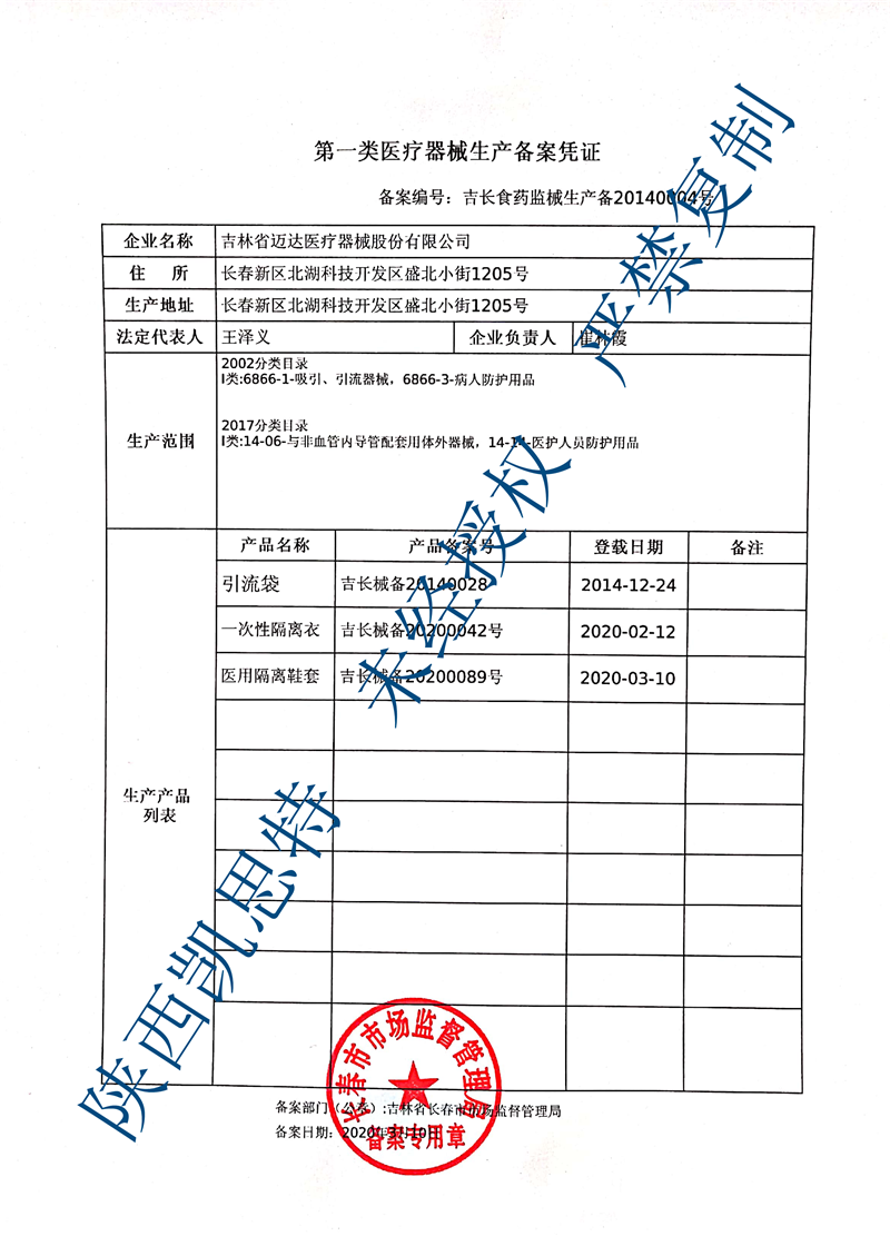 医疗器械生产备案凭证编号:吉长食药监械生产备20140004号